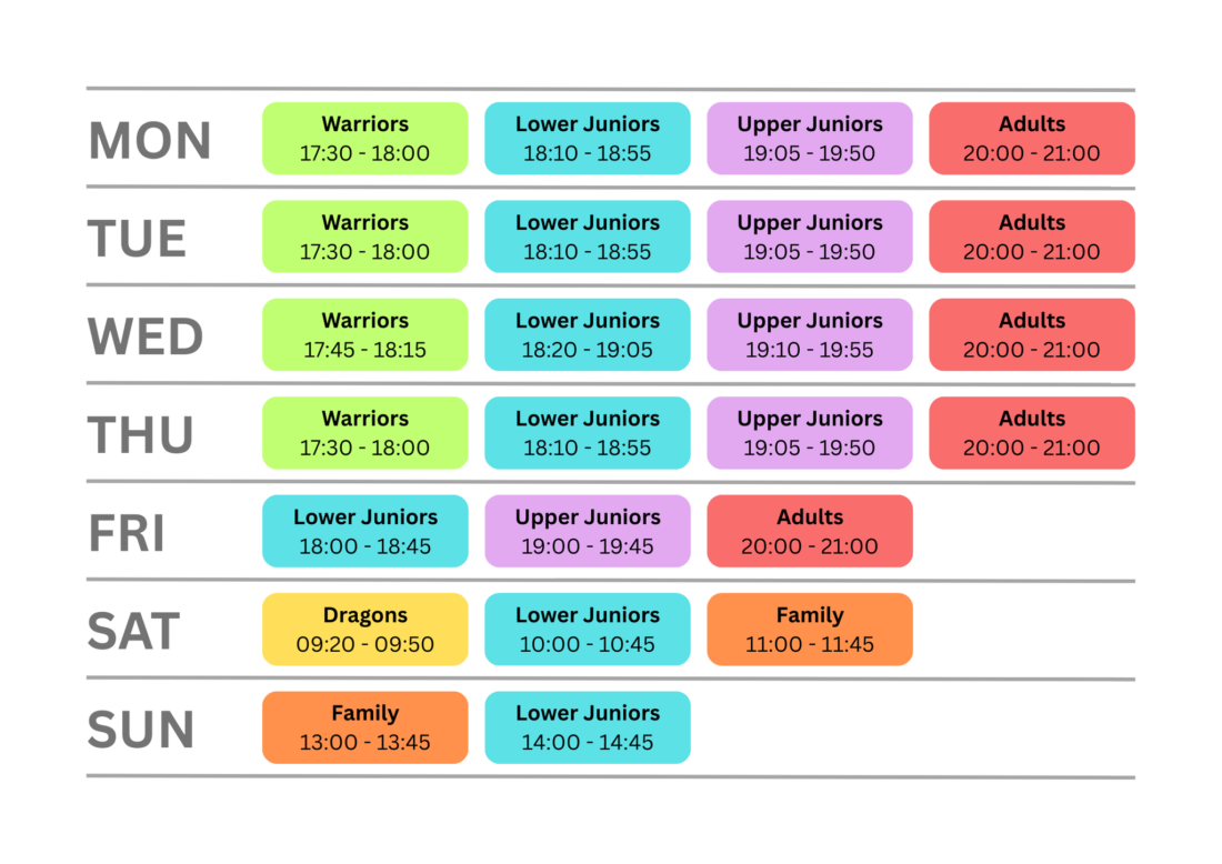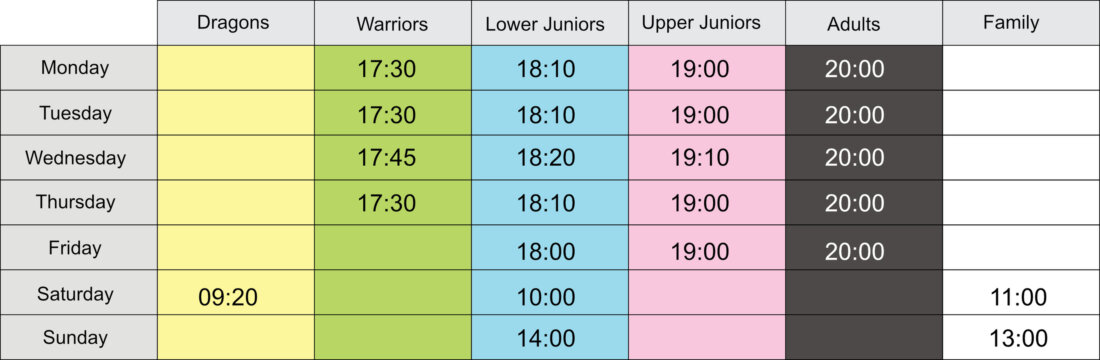 Our Dragons class is for pre-school age, warriors for those 4-7. and then our junior classes are split on age but also height, as this is a combat art we need to try and make sure every student is safe to partner others.